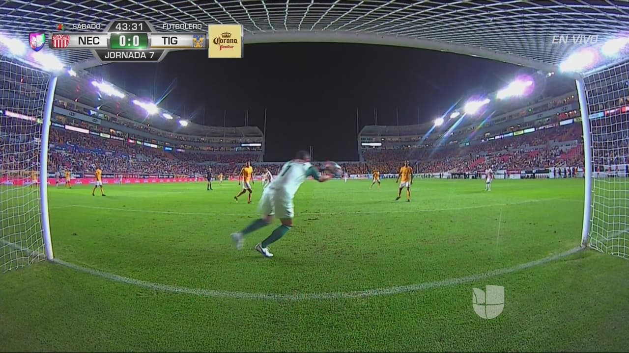 El delantero del Necaxa se perdió una gran oportunidad de abrir el marcador pero no supo darle fuerza y dirección a su remate.