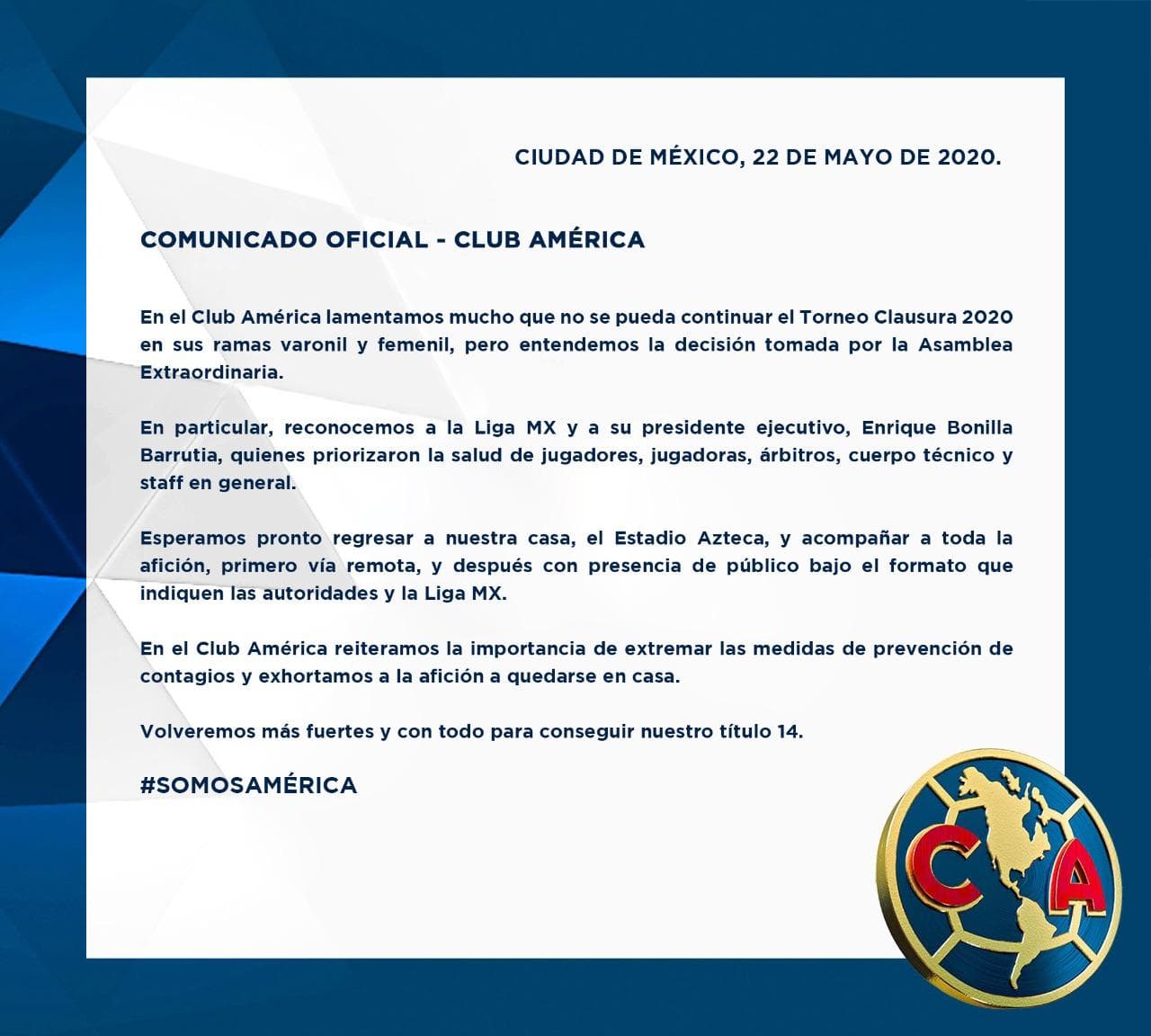 Las Águilas, a través de un comunicado oficial, reconoce que las autoridades del futbol mexicano hayan priorizado la salud del entorno del futbol mexicano antes que otra cosa.