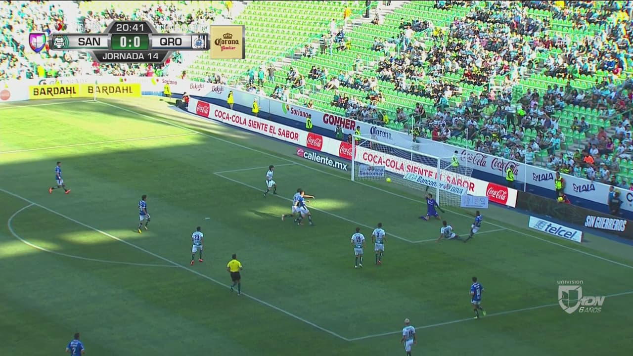 El atacante colombiano del Querétaro se sacó la marca de tres guerreros en el área lagunera y cruzó su disparo que se estrelló en el palo derecho de la cabaña santista.