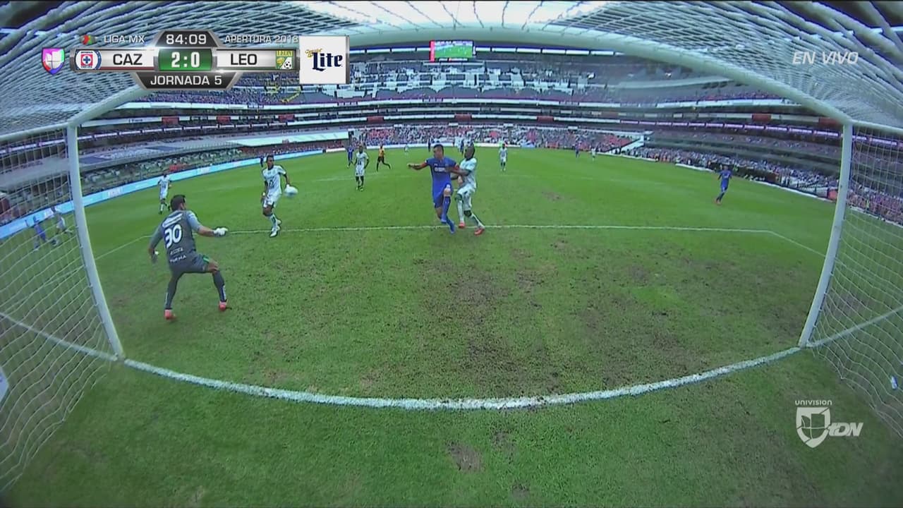 Cuando tenía todo para marcar su gol, el delantero celeste no encontró la pelota y fue la defensa del León la que despejó cuando Cota estaba vencido.