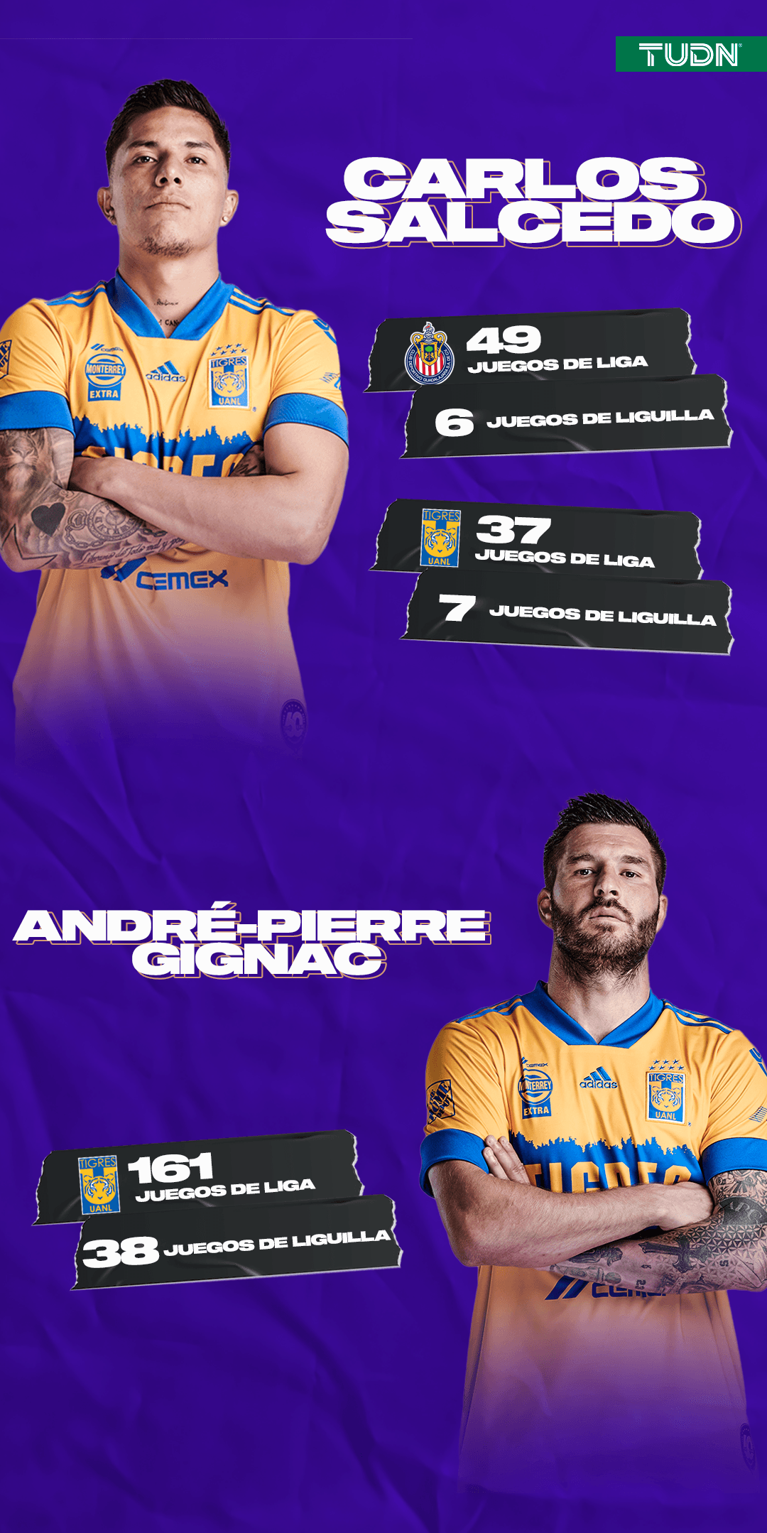 Tigres salta a la cancha contra Atlético de San Luis con dos jugadores que llegan a cifras históricas dentro de la Liga BBVA MX; Carlos Salcedo suma 100 partidos ligueros entre Chivas y Tigres, mientras que André-Pierre Gignac lleva la cuenta a 200 encuentros ligueros, todos con los ‘felinos’.