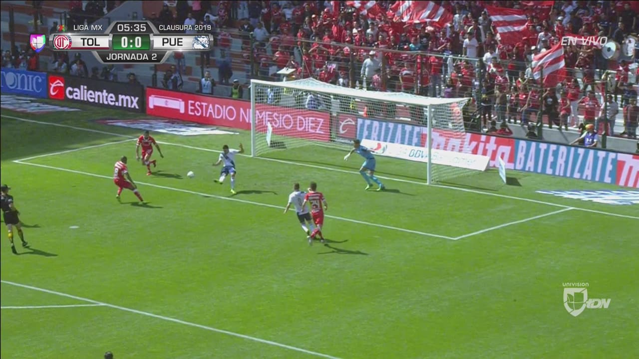 Centro peligroso del ‘Quik’ Mendoza por derecha, la zaga intentó rechazar, el balón dio en el rostro de William, pero terminó pasando a un costado del arco poblano.