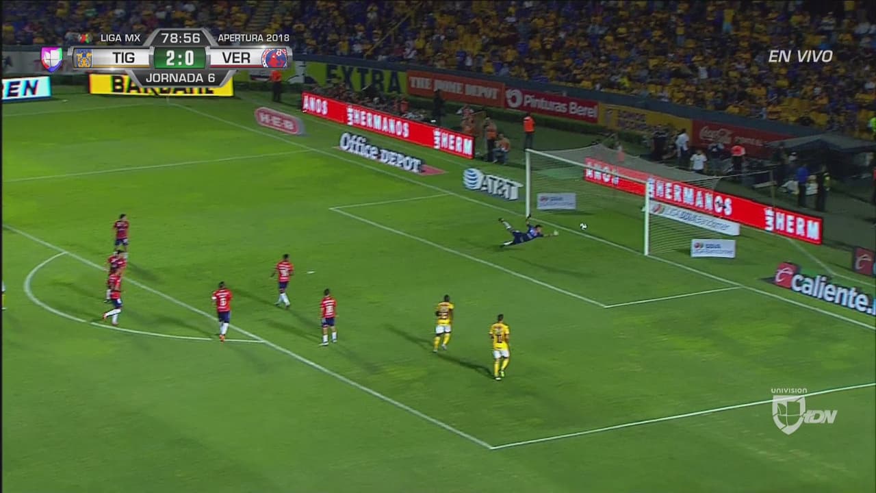 El chileno de Tigres controló y disparó colocado pero la pelota se fue celosamente a un lado. Los Tiburones siguen librando la goleada en el Volcán.