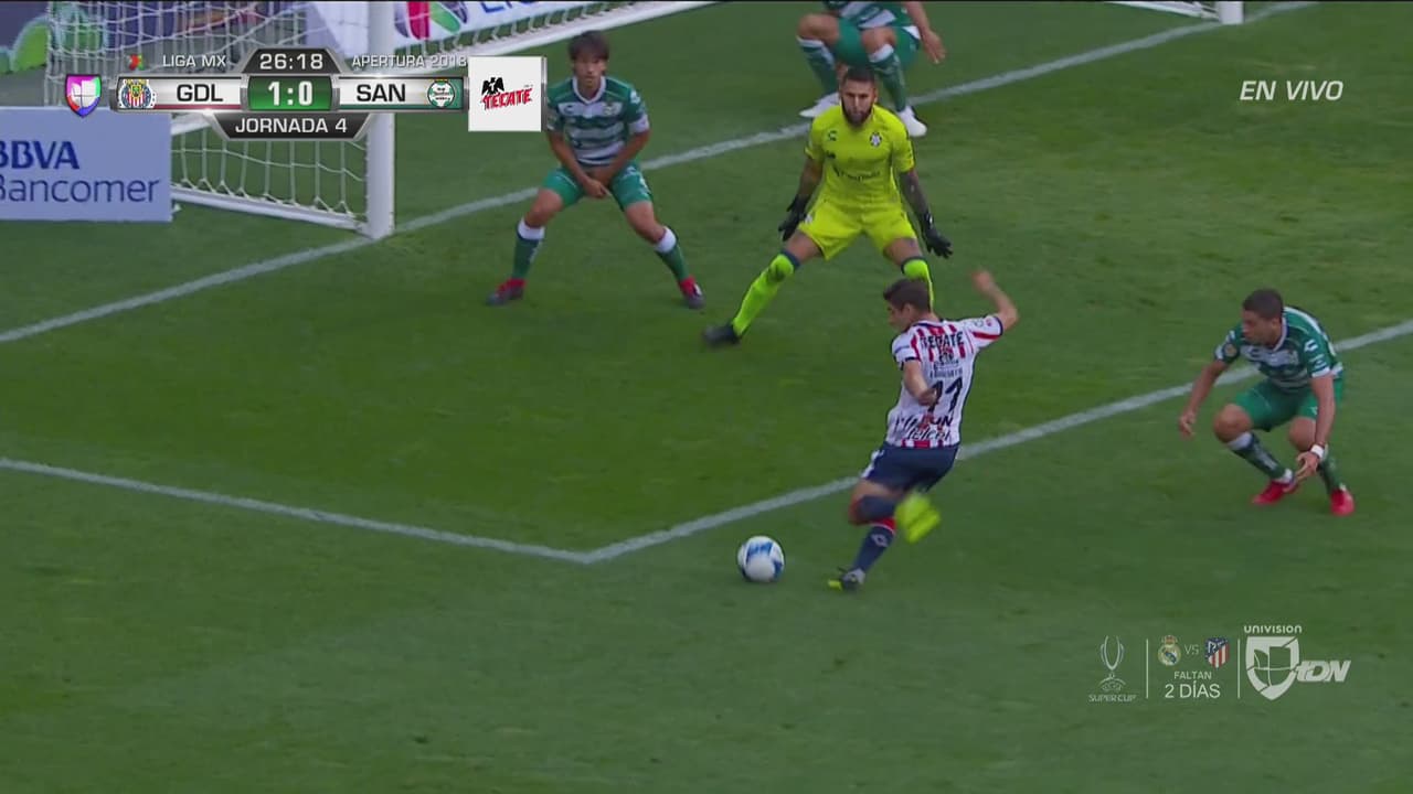 Brizuela recibió sólo en el área y con total complacencia de la defensa lagunera disparó en dos ocasiones y abrió el marcador, ya lo gana el local.