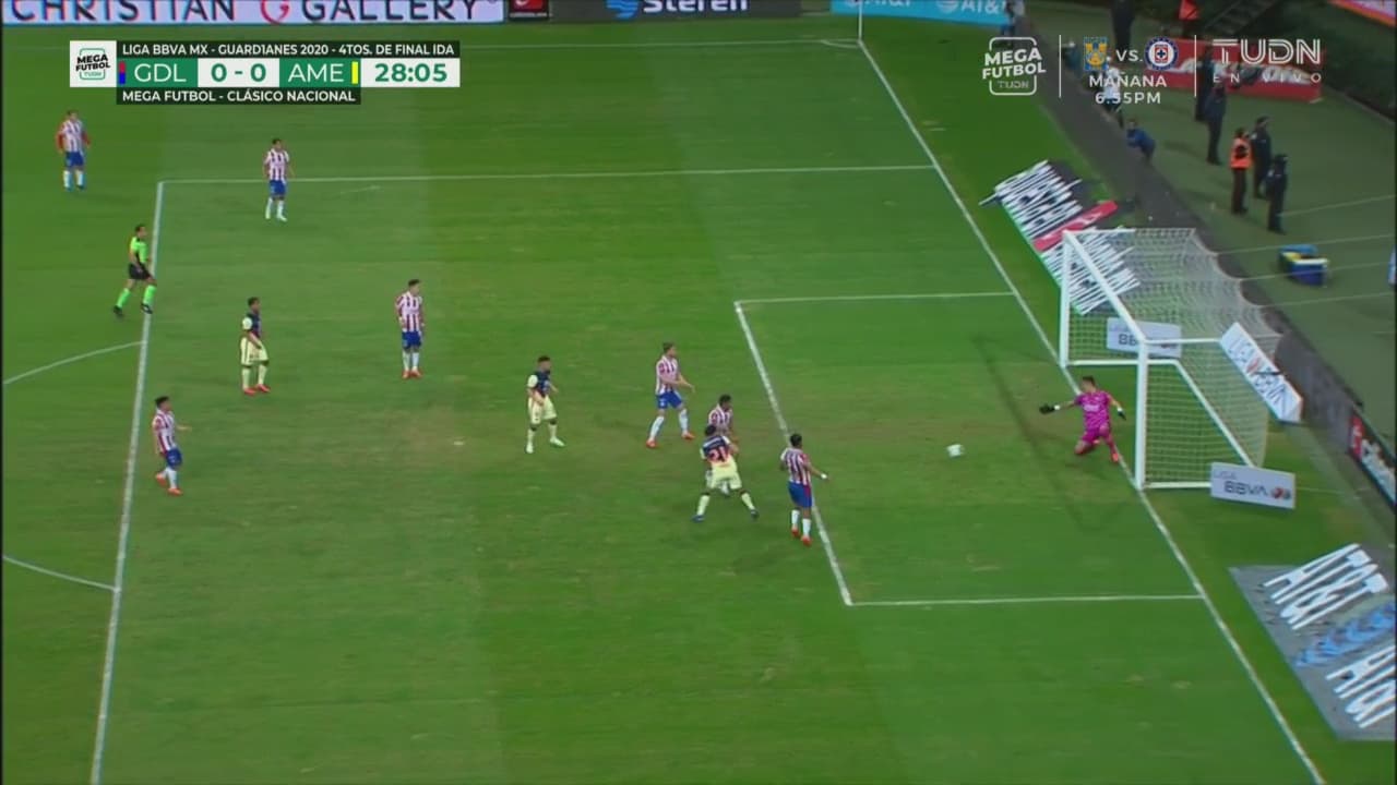 Sebastián Córdova prueba de media distancia pero Gudiño lo hace ver fácil y se queda con la pelota.