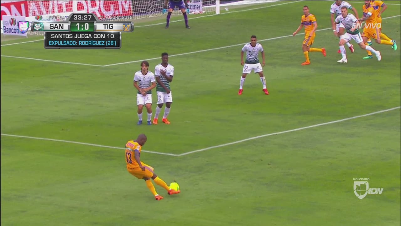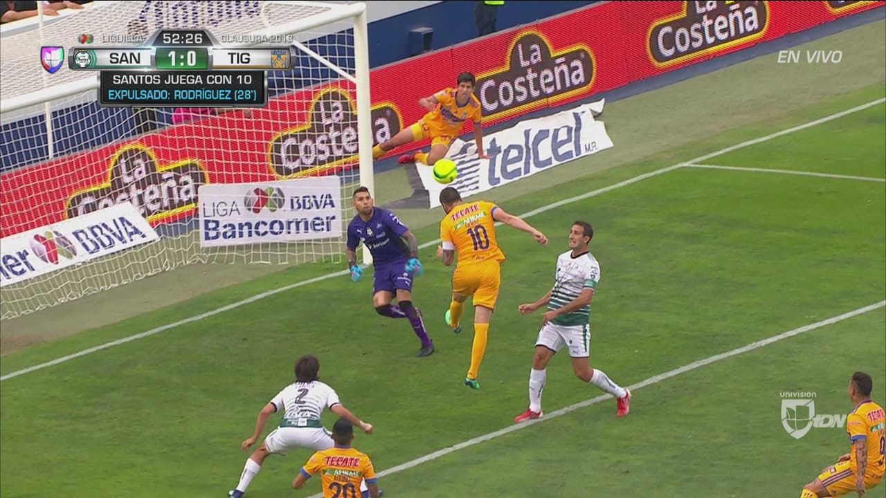 Tras la expulsión de Rodríguez, Santos se vino abajo y perdió la posesión del esférico. Tigres aprovechó y estuvo a nada de meter el empate antes de irse al descaso, pero el poste le dijo que no.