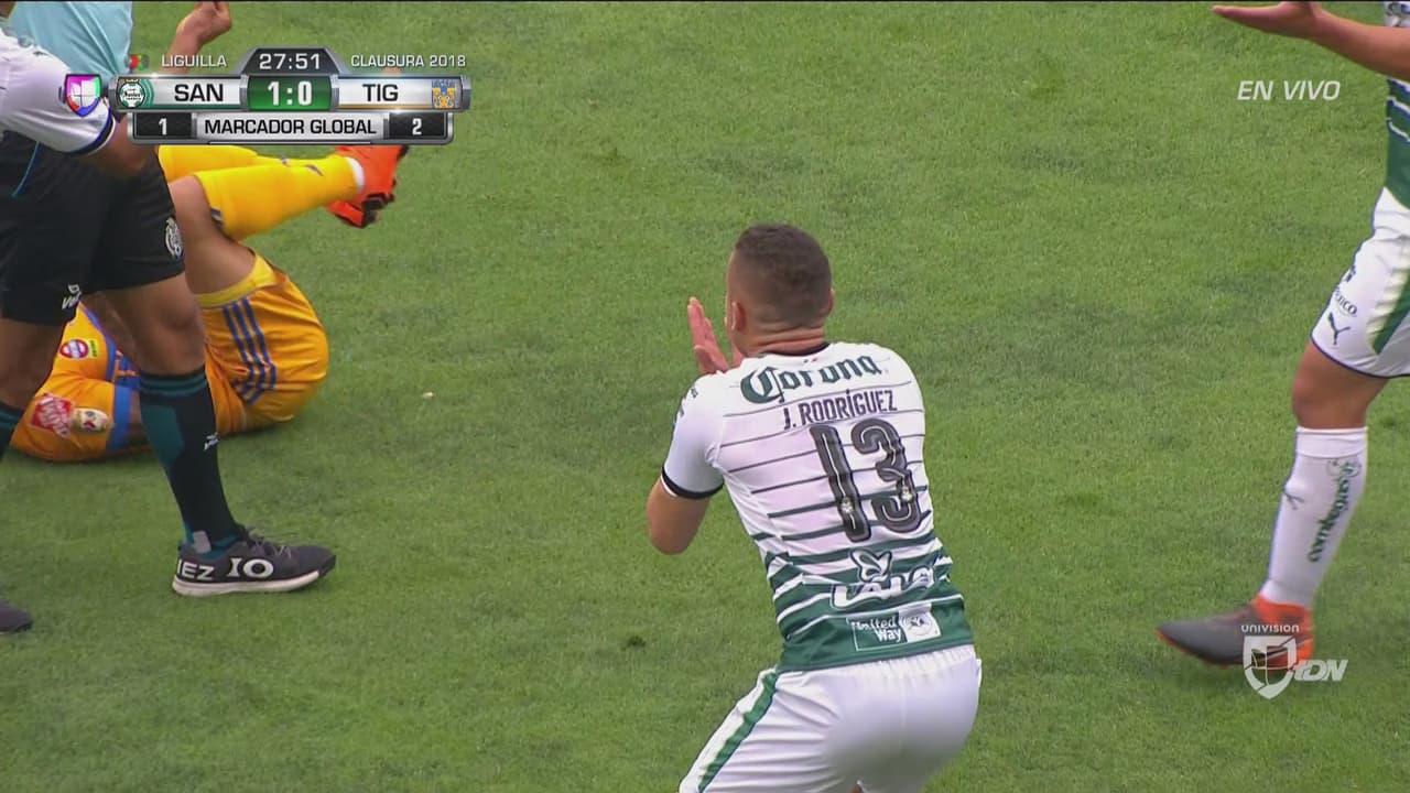 Una desafortunada entrada sobre Javier Aquino privaría a Rodríguez, el jugador más participativo de Santos, de disputar el resto del encuentro. La decisión del árbitro es polémica, pues se podría argumentar que la falta no era para una roja directa.