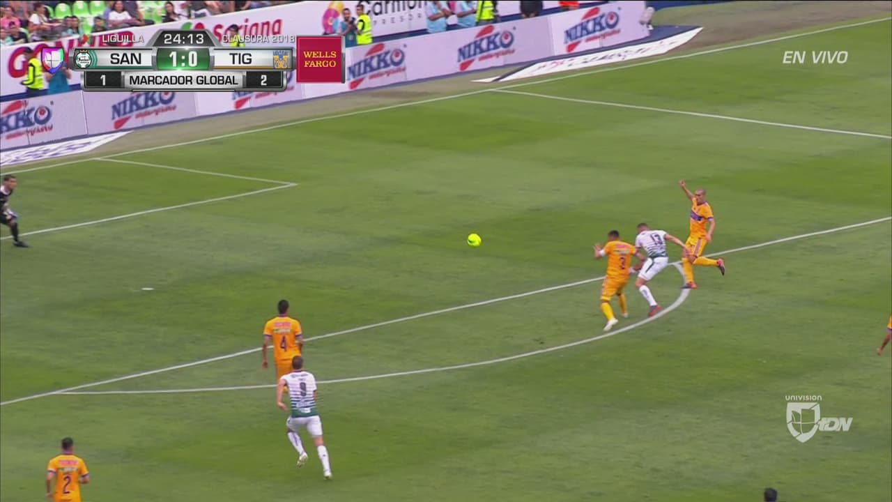 Tras irse al frente, Santos provocó una falta a favor, inexistente, al borde de la media luna de Tigres. La sanción fue un tiro libre directo que Osvaldo Martínez no perdonó con un toque magistral al poste más lejano de Nahuel Guzmán. El Estadio Corona explotó y los ánimos y la esperanza regresaron a los 11 sobre el campo y a los miles en las gradas.