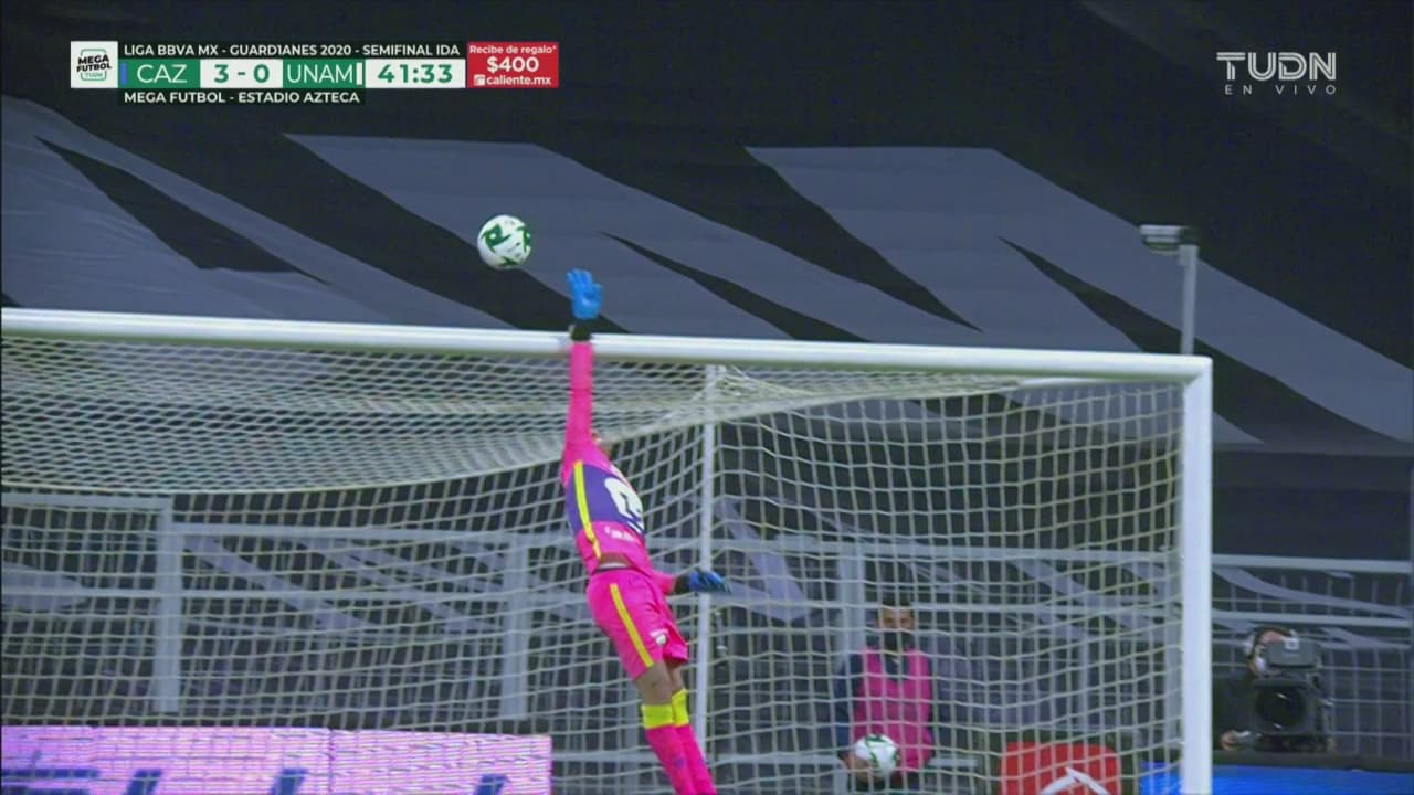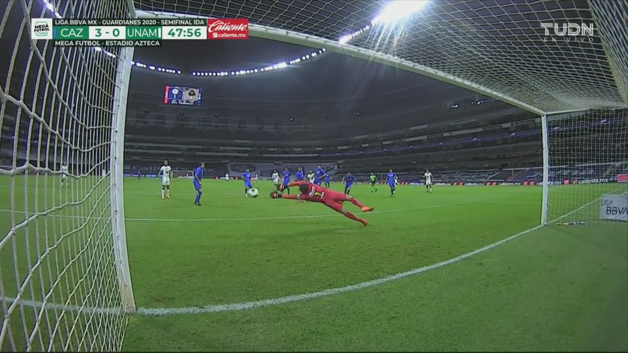Chuy Corona sa lanza con todo su ser y evita el gol qu le daba vida a los universitarios.