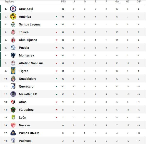 Cruz Azul está a la cabeza con 18 puntos, seguido de América que ha sumado 16 con Santiago Solari y los de Almada están terceros con 15 unidades. Siguen Toluca (14) y Xolos de Tijuana (13) en el Top 5.