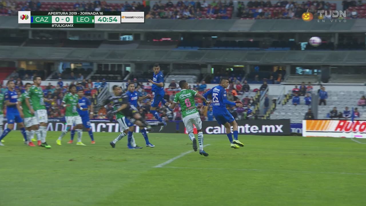 El defensa celeste no aprovecha una mala salida de Rodolfo Cota a balón parado y su remate sale desviado de la portería.