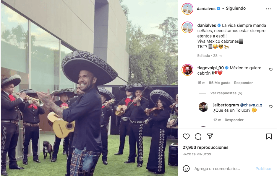 “La vida siempre manda señales, ¡necesitamos estar siempre atentos a eso! ¡Viva Mexico cabrones! ¿TBT?” escribió Dani Alves acompañado de cuatro emojis de carita alocada, de risa y con lentes oscuros, además de un felino que parece más un jaguar que un puma o, incluso, un tigre.