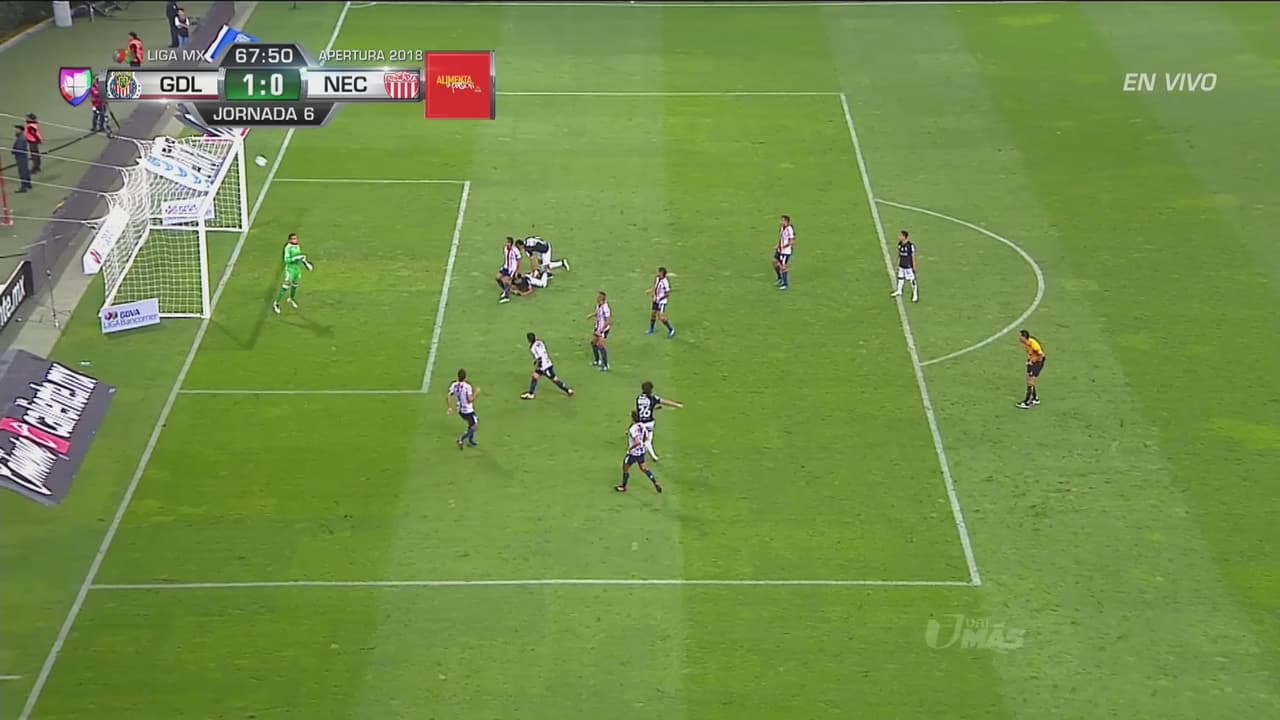 El chileno del Necaxa la bajó bien en el área, pero su disparo se fue muy por encima de la portería rojiblanca.