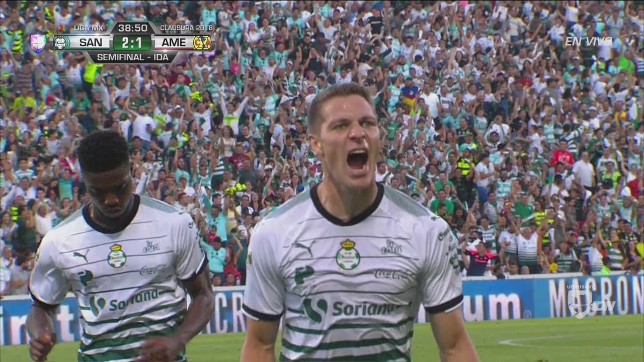 Santos respondió rápido. Si hasta ese momento Agustín Marchesín ya había salvado varias veces al América, en esta ocasión el argentino colaboraría para el 2-1 de Santos tras un disparo de Julio Furch que entró pegado en el arco del argentino.