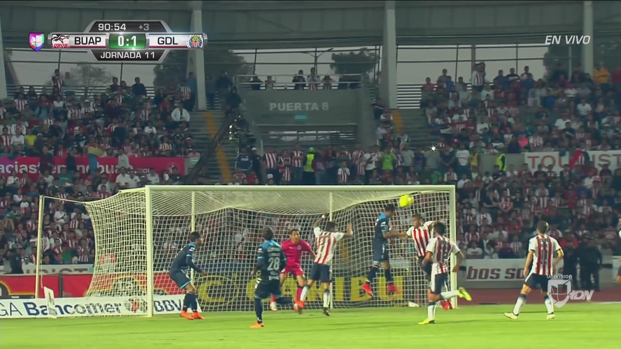 Ya en tiempo de compensación el delantero del conjunto local remató de cabeza a quemarropa, pero el balón fue directo a la humanidad de Rodolfo Cota. Chivas se salvó del empate.