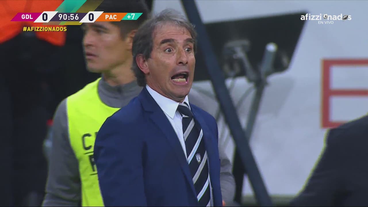El árbitro le muestra la roja al técnico de Pachuca, quien pedía mano de Briseño dentro del área.