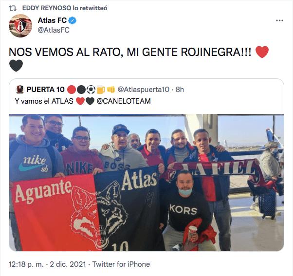 Más tarde, la cuenta oficial del Atlas en Twitter comentó el tuit: “¡Nos vemos al rato, mi gente rojinegra!” y el cual Eddy Reynoso dio retwitt, al igual que lo hizo a la cuenta de la Porra 10.