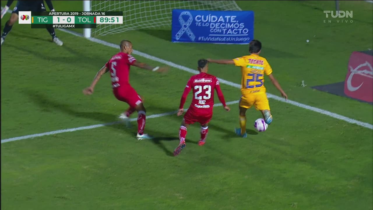 Jürgen hizo una de las suyas, pero el portero de Toluca sacó la mano para desviar el peligroso remate.