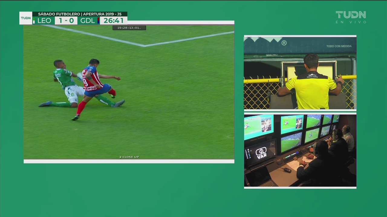 El árbitro recurre al VAR para revisar una dudosa mano en el área de León que hubiera sido un penalti para el Guadalajara.
