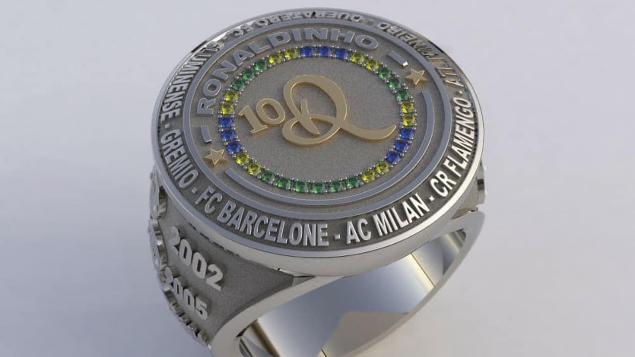 El brasileño Ronaldinho publicó en sus redes sociales una fotografía de un anillo en el que se muestran los nombres de los equipos en los que jugó, así como los trofeos y reconocimientos más importantes que tuvo a lo largo de su carrera futbolística.