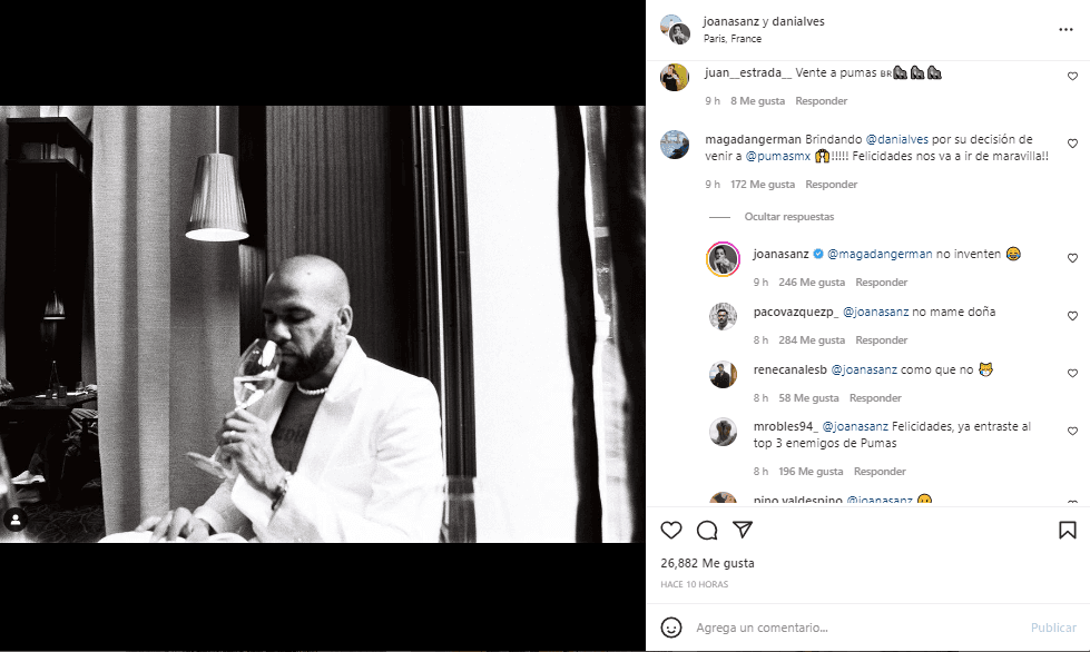 "Brindando Dani Alves por su decisión de venir a Pumas. Felicidades nos va a ir de maravilla", escribió un aficionado en Instagram, publicación a la que la pareja del brasileño respondió: "no inventen", acompañada con un emoji de risas con lágrimas.