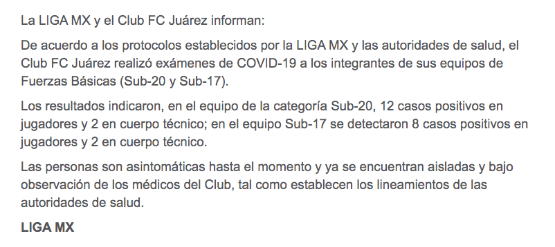 FC Juárez anunció este viernes que luego de realizar exámenes para la detección de COVID-19 entre sus equipos Sub 17 y Sub 20, 24 personas resultados positivas entre jugadores y cuerpo técnico.