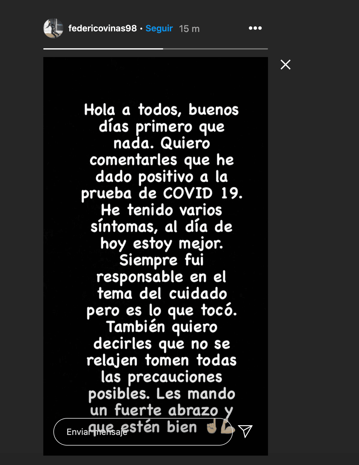 El Club América y la Liga BBVA MX informaron que un jugador de su plantilla arrojó positivo por COVID-19 y ya está bajo observación. Federico Viñas compartió un mensaje mediante su cuenta de Instagram para confirmar su situación actual.