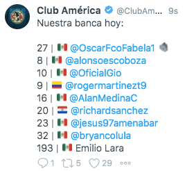 Tras darse a conocer las alineaciones del encuentro, el uruguayo no apareció en la lista de suplentes de Santiago Solari, las Águilas entonces tuvieron nueve hombres de cambio disponibles y no los 10 permitidos, como sí los tuvieron los Rojinegros.
