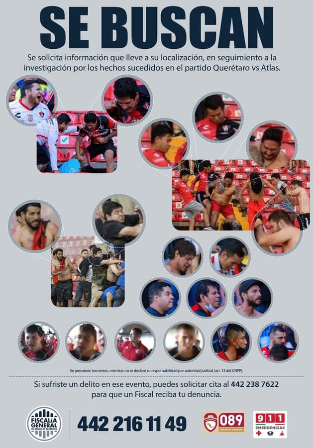 “Al continuar las investigaciones se ha logrado identificar a otros intervinientes de los hechos ocurridos el 5 de marzo en el Estadio La Corregidora. Por ello, se solicita la colaboración de la ciudadanía para que quien cuente con información que pueda ayudar al paradero de estas personas, la proporcione al 442 238 7622 o al 442 216 1149. Dicha información es confidencial por disposición legal.