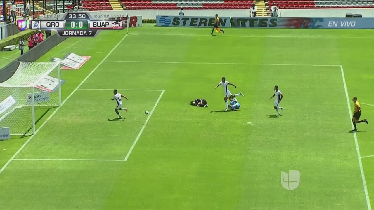 Matías Britos penetra el área rival, el portero licántropo pierde en el achique y finalmente es Michael Orozco quien evita la caída de su arco.