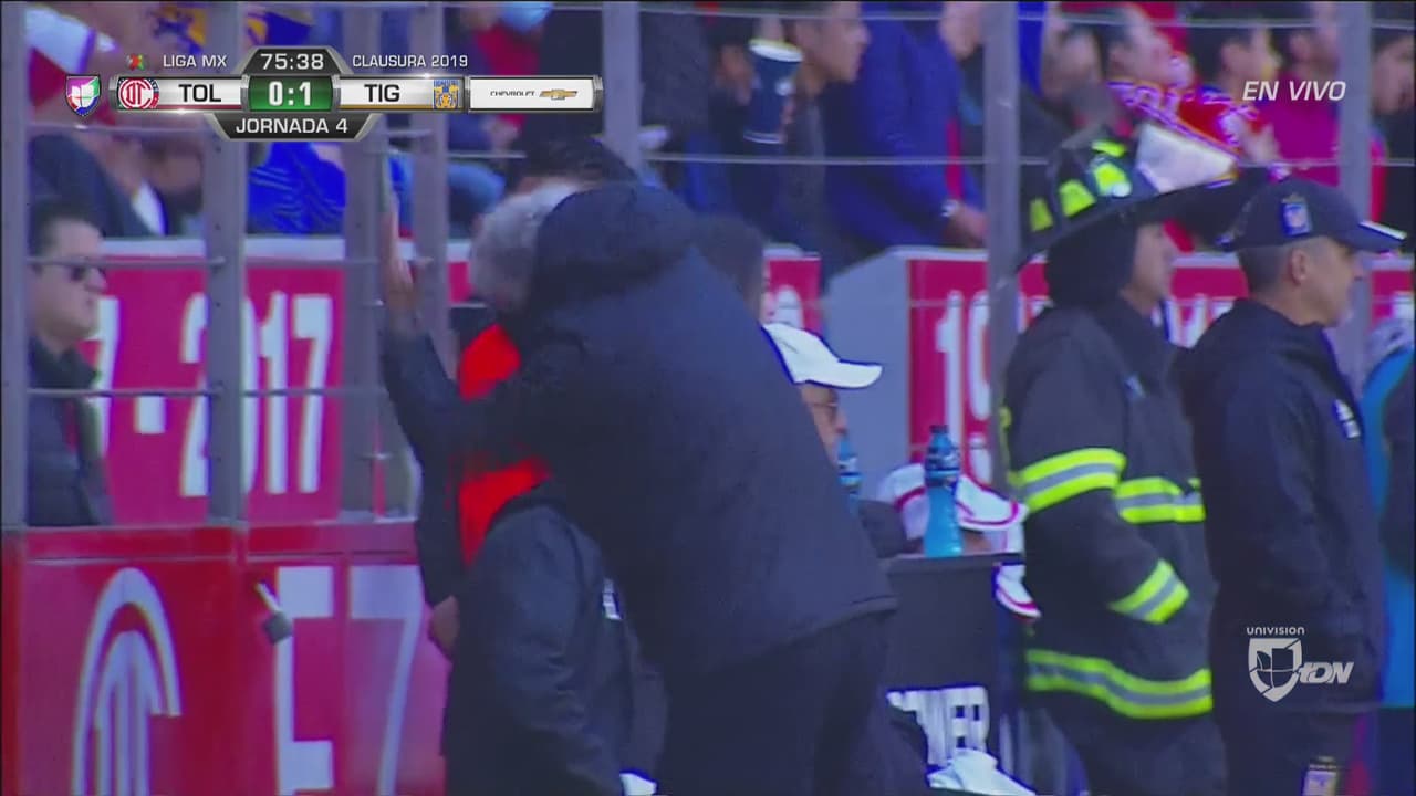 El refuerzo de Toluca la tuvo solo frente a la portería de Nahuel, pero le pegó muy suave. Al tiempo el DT de Tigres manoteó de la rabia por el error de sus zagueros.