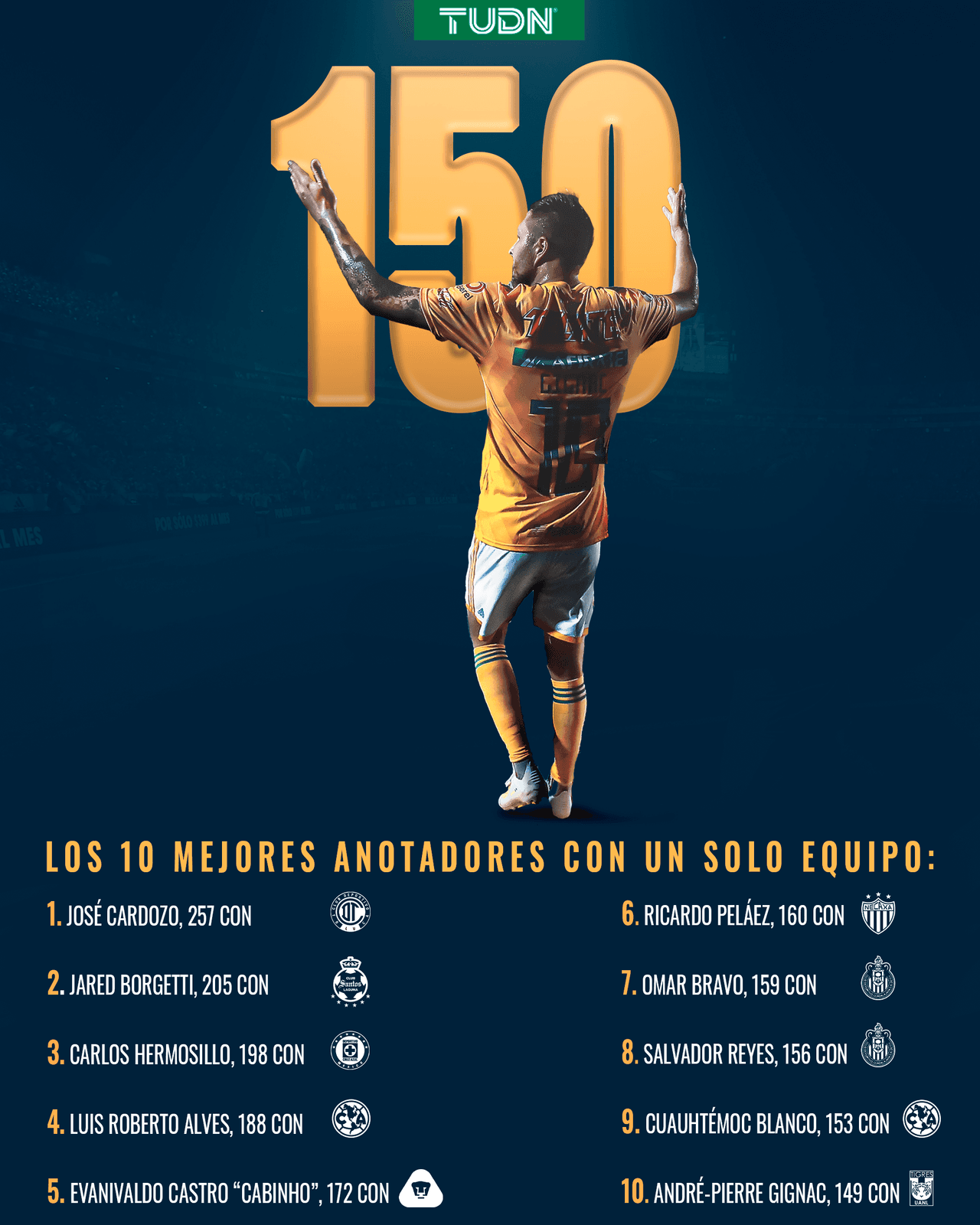 El delantero francés André-Pierre Gignac, de anotarle a Chivas en partido de la Fecha 17 del Torneo Guard1anes 2021 de la Liga BBVA MX, llegará a 150 goles en partidos oficiales con Tigres, convirtiéndose así en el décimo jugador con tal cantidad para un solo club en la historia.