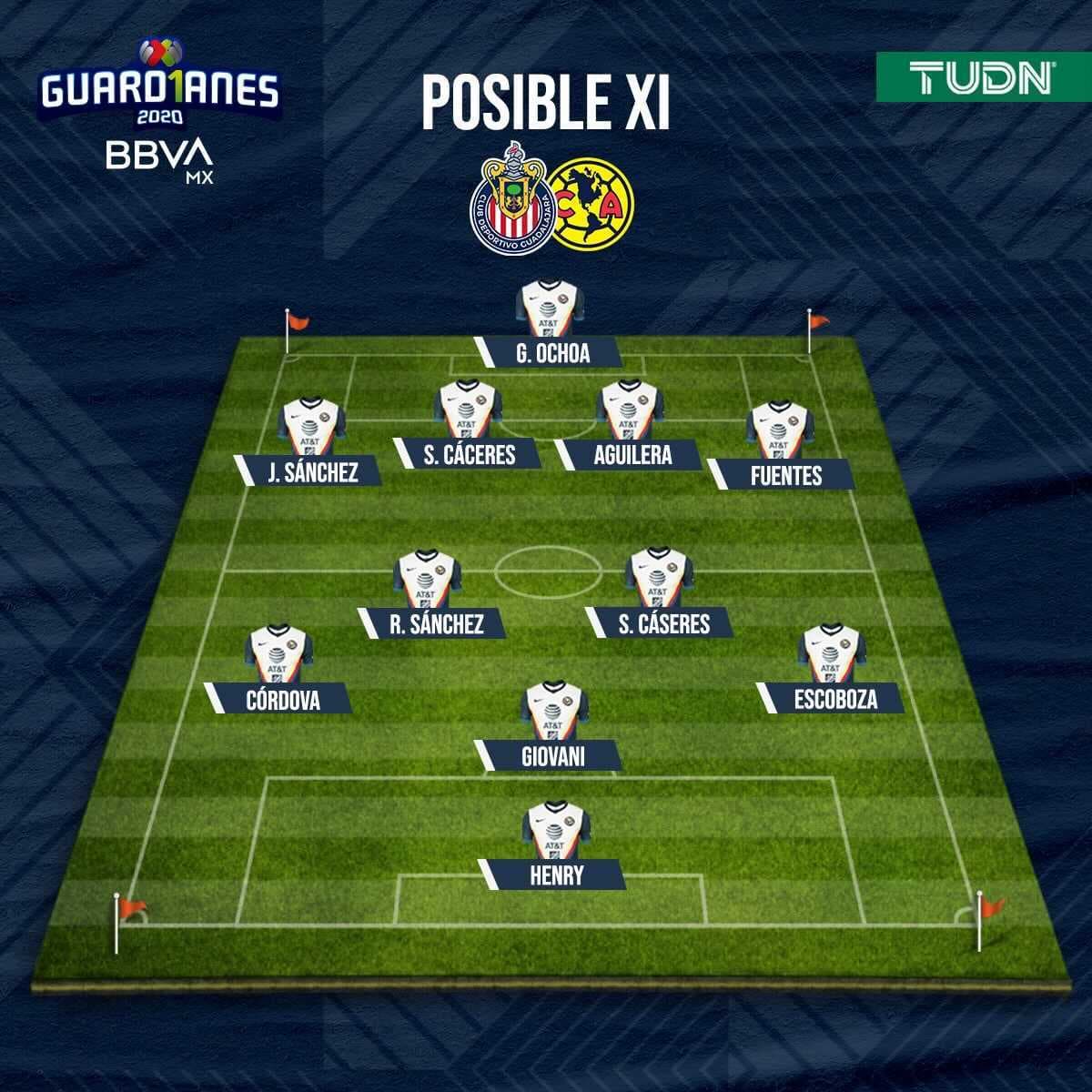 La escuadra del América tendría definido el equipo titular para duelo frente a las Chivas, correspondiente a la ida de los cuartos de final del Guard1anes 2020 BBVA MX, destacando la vuelta de Giovani Dos Santos.