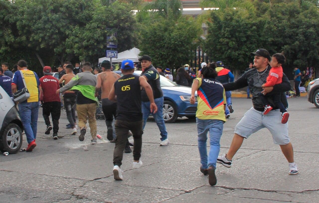 Minutos después llegó el resto de la barra del Atlético de San Luis conocida como La Guerrilla para increpar a los americanistas que al verse superados corrieron, pero en el camino un hincha de San Luis con un niño en brazos golpeó a uno de los americanistas hasta dejarlo en el suelo.