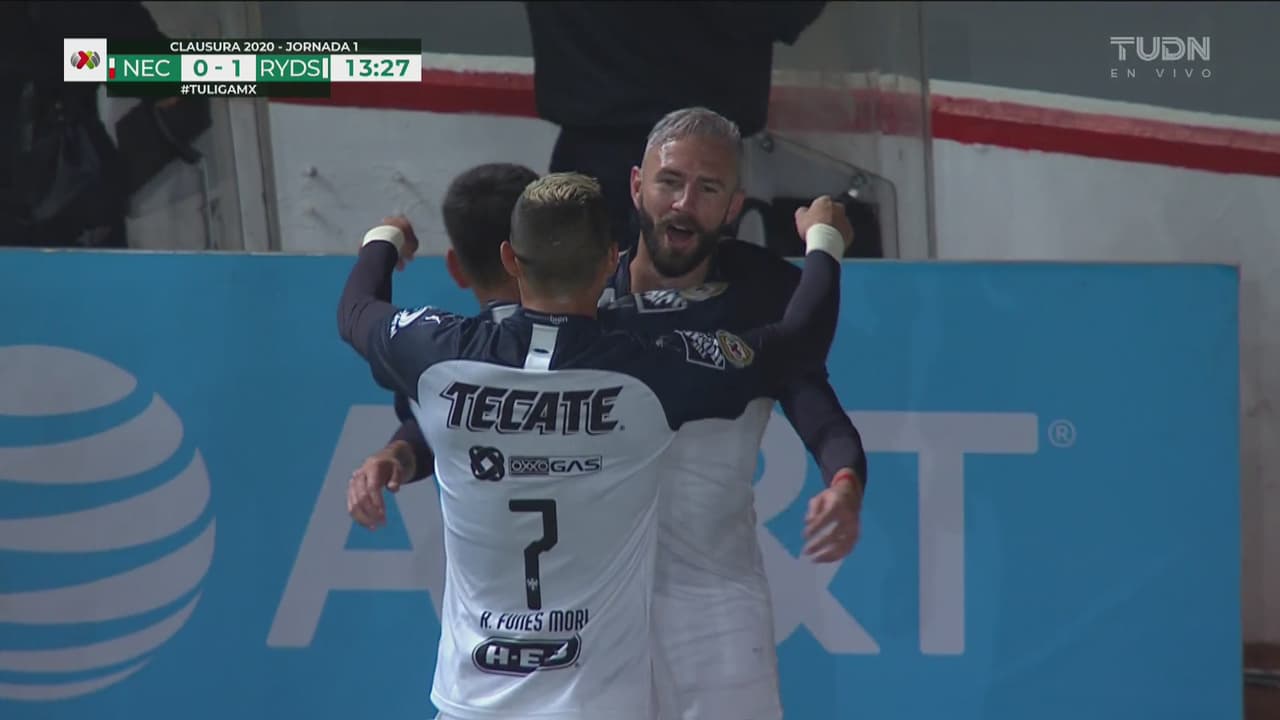 El lateral de Rayados se encuentra un rebote y de derecha manda el balón al fondo de las redes.