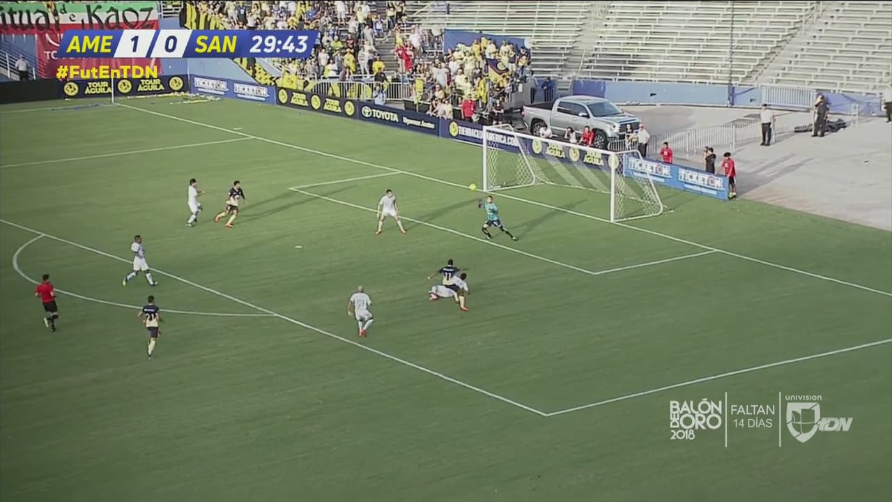 El colombiano Andrés Felipe Ibargüen tiene una avenida por la derecha, se cuela hasta el área, recorta pero saca un zurdazo arriba del arco lagunero.