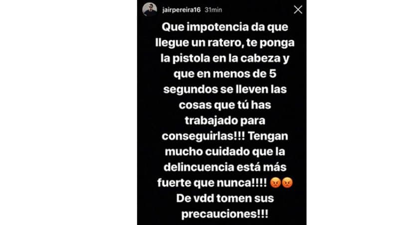 “Que impotencia que llegue un ratero, te ponga la pistola en la cabeza y que en menos de 5 segundos se lleven las cosas que tú has trabajado para conseguirlas. Tengan mucho cuidado que la delincuencia está más fuerte que nunca. De verdad tomen sus precauciones”, publicó Pereira en sus redes sociales.