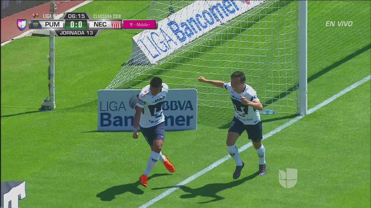 El volante de la UNAM le ganó la espalda al central y conectó de cabeza un servicio de Pablo Barrera para adelantar a los felinos ante Necaxa.