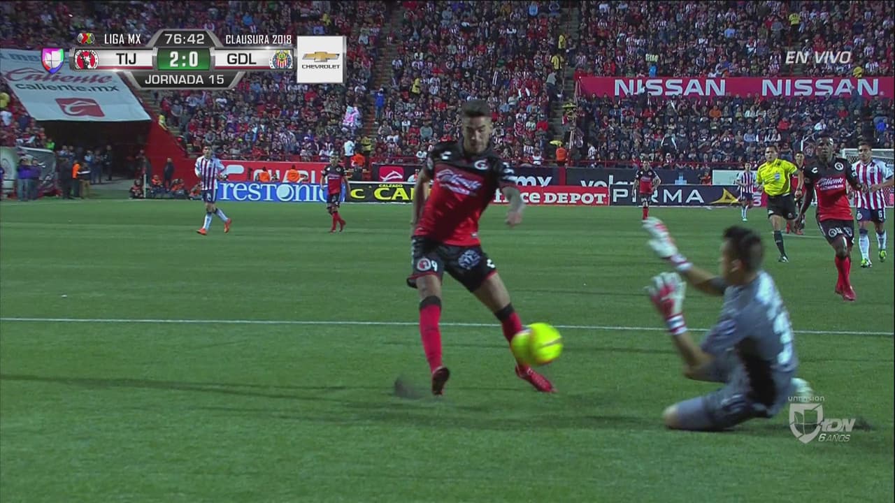 Lucero aprovechó pase en profundidad y al intentar cruzar el balón, Miguel Jiménez achicó y salvó a Chivas del recibir el tercero.