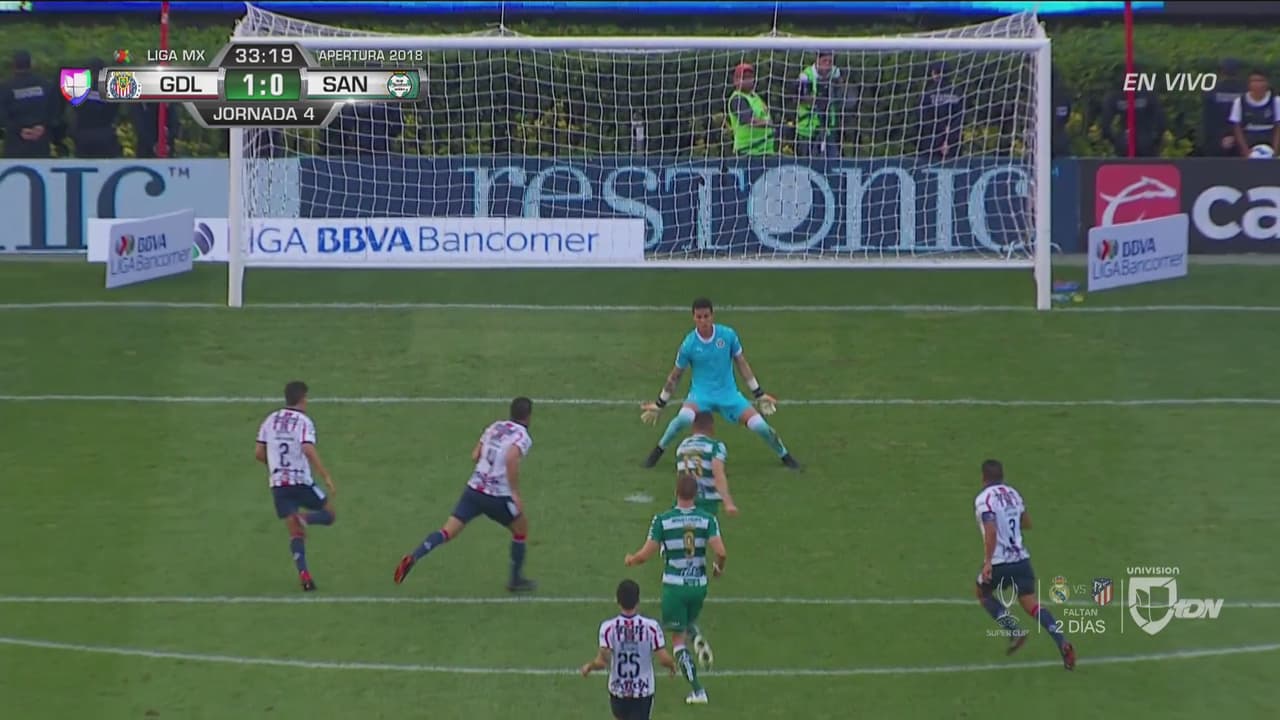 Jonathan Rodríguez se quitó a Pereira con un 'sombrerito' y disparó con fuerza, no obstante, Raúl Gudiño detuvo el esférico.