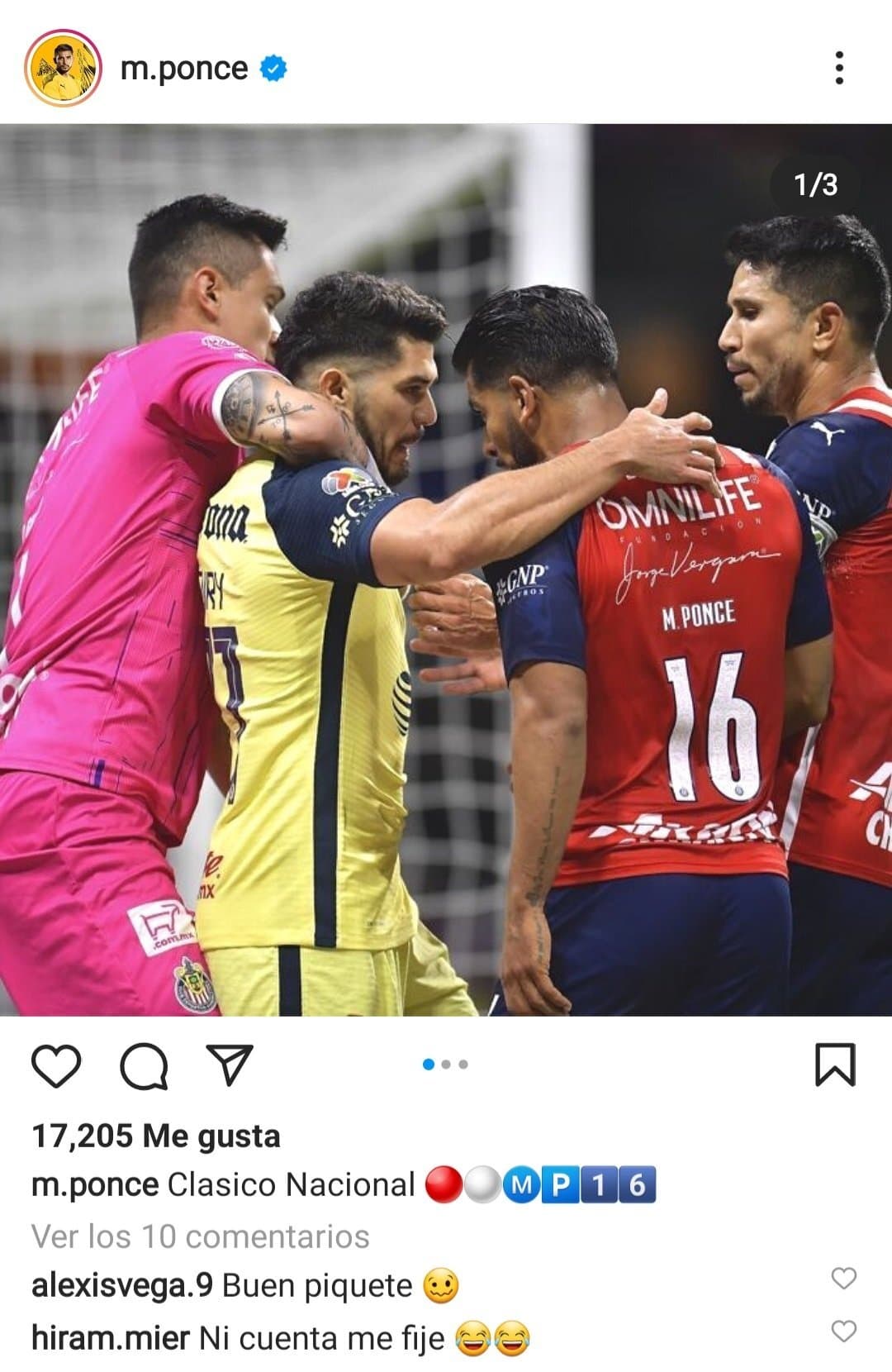 Los ecos del Clásico del futbol mexicano se siguen escuchando. Un partido que no tuvo goles pero sí polémica y Miguel Ponce se encargó de recordar una escena que genero un conato de bronca, pues en sus redes sociales publicó una fotografía del momento en el que se encaró con Henry Martín a quién le propinó un piquete de ojos que no fue sancionado por el silbante. Dicha publicación fue comentada por sus compañeros de Chivas, quienes ironizaron con dicha acción.