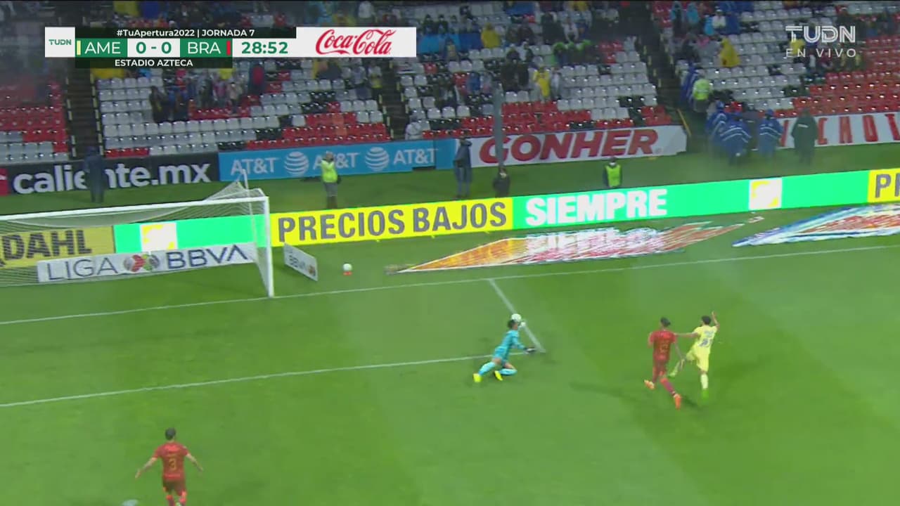 Balón filtrado de Zendejas para el ‘21’, quien disparó a un costado ante la marca de Salcedo al 29’.