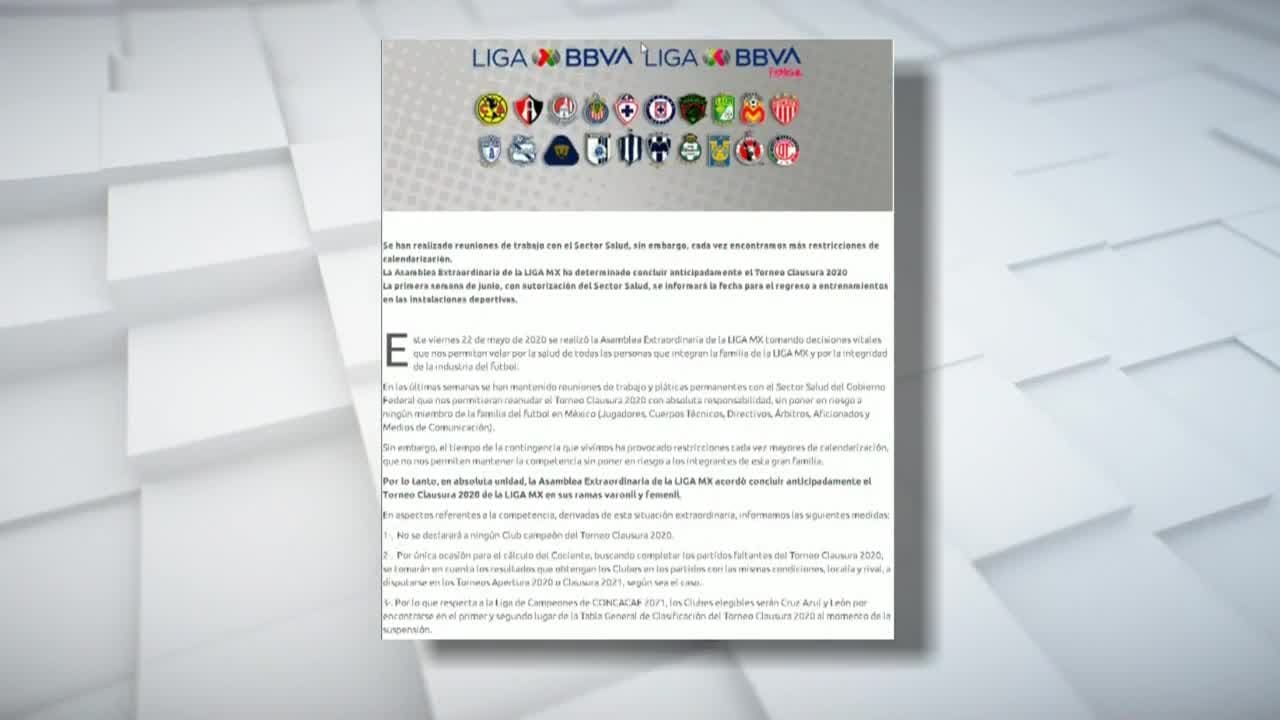 "Por lo tanto, en absoluta unidad, la Asamblea Extraordinaria de la LIGA MX acordó concluir anticipadamente el Torneo Clausura 2020 de la LIGA MX en sus ramas varonil y femenil", señaló el comunicado que envió el organismo como las causas de la terminación del torneo.