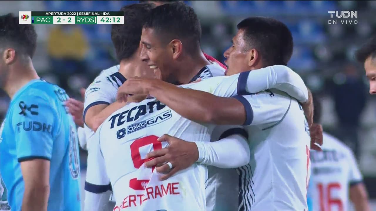 Luis intentó entrar dos veces al área, pero el rebote le beneficia y le pega de primera, igualando para Rayados.