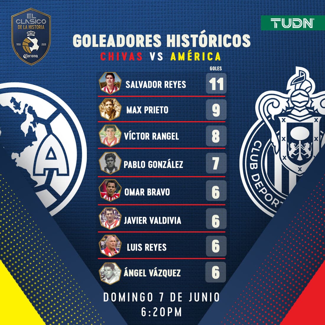 1. Salvado Reyes: Don Chava ha permanecido en este lugar por más de 50 años con sus 11 goles que le hizo al América en varios partidos donde los enfrentó y hasta les ganó títulos en el futbol mexicano.