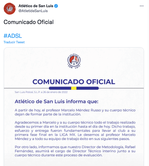 Marcelo Méndez dejó de ser director técnico del Atlético de San Luis luego de tres jornadas disputadas en el Grita México C22 de la Liga MX en el que perdió todos los encuentros y se ubica en la última posición de la tabla de clasificación.
