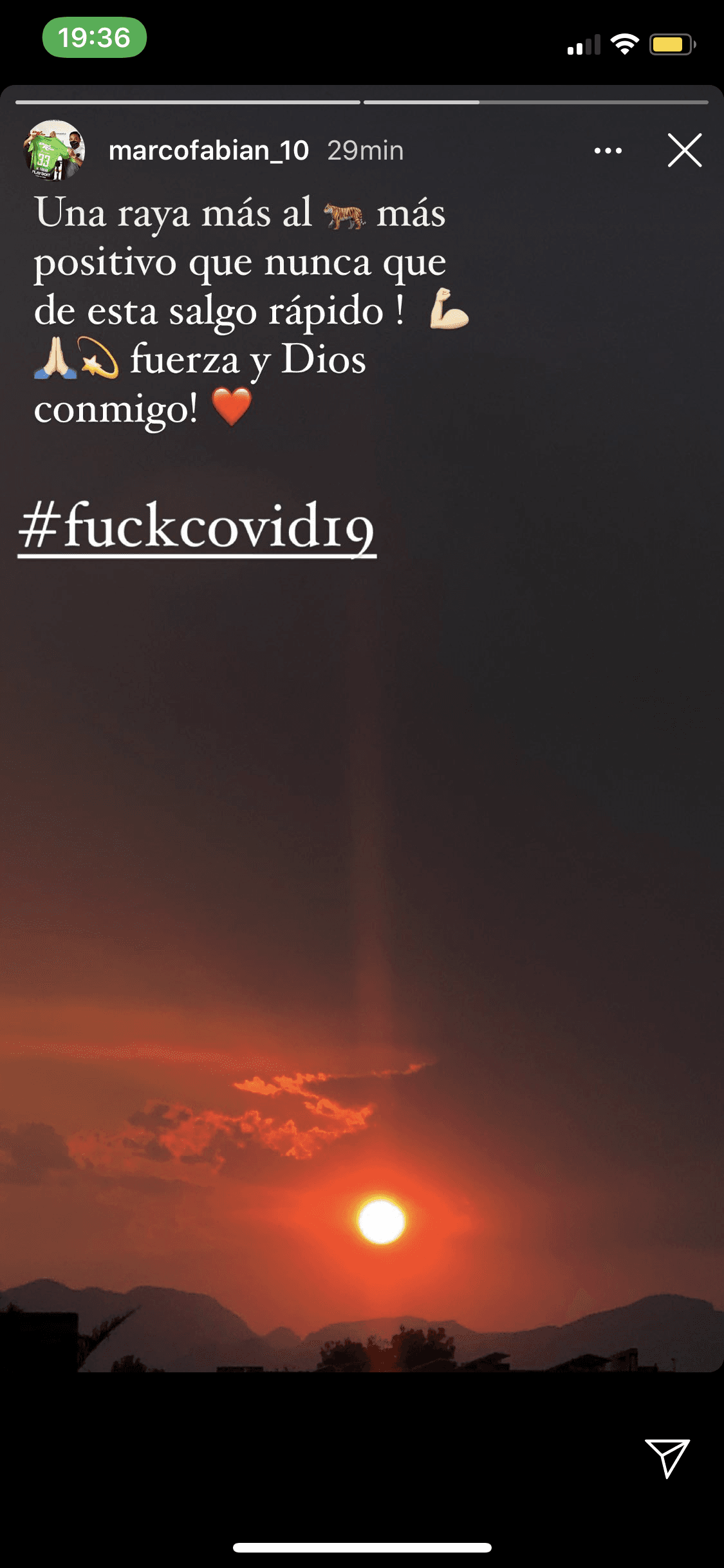 “Una raya más al tigre. Más positivo que nunca, que de ésta salgo rápido. Fuerza y Dios conmigo”, posteó el jugador mexicano en sus insta stories este miércoles por la noche.