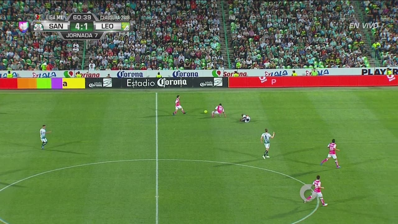 El defensa de León se lanzó una fuerte barrida en medio campo sobre el goleador de la Laguna, que reclamó al silbante por no sacar la tarjeta.