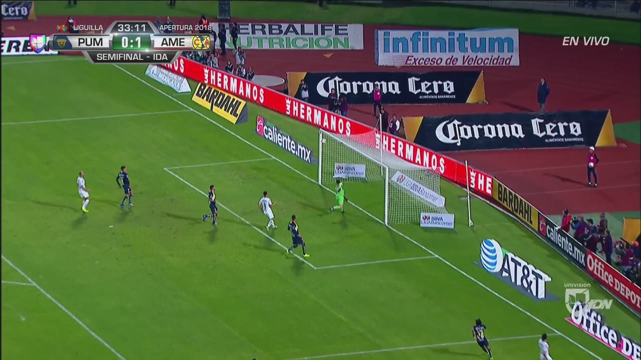 Tiro-centro del lateral de los Pumas que se fue cerrando y se quedó a centímetros de ser un golazo para el empate.