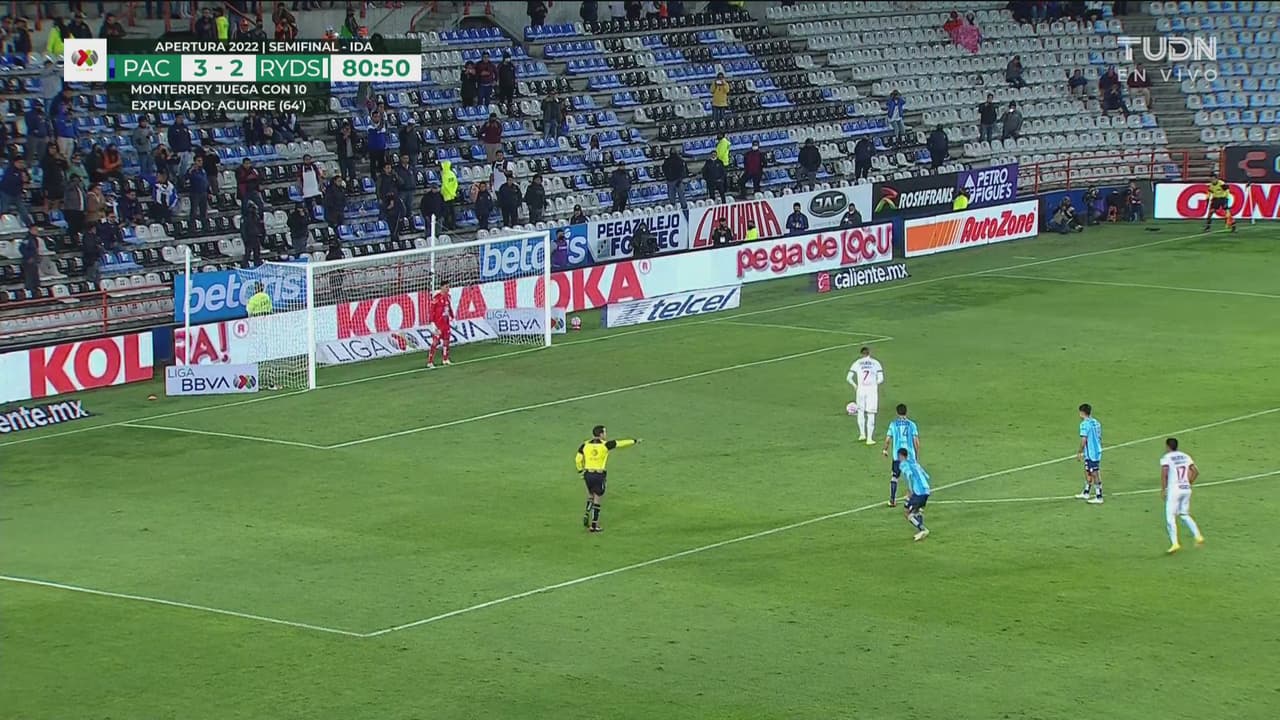 Óscar se resbala y derriba en el área a Jesús Gallardo, pero lava su error deteniendo el disparo de Rogelio.